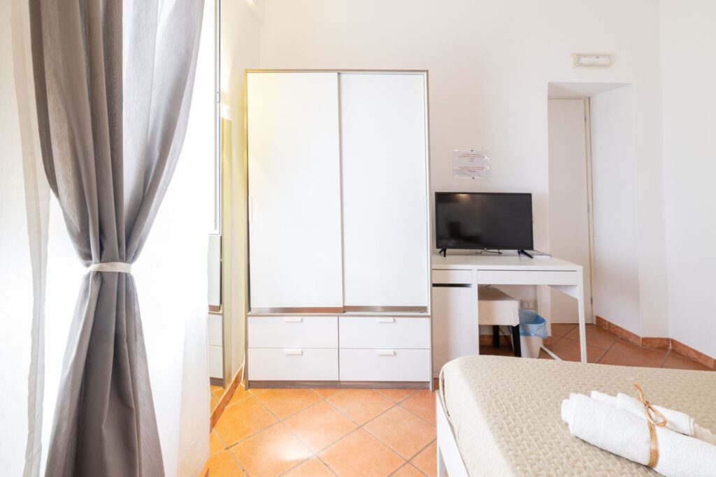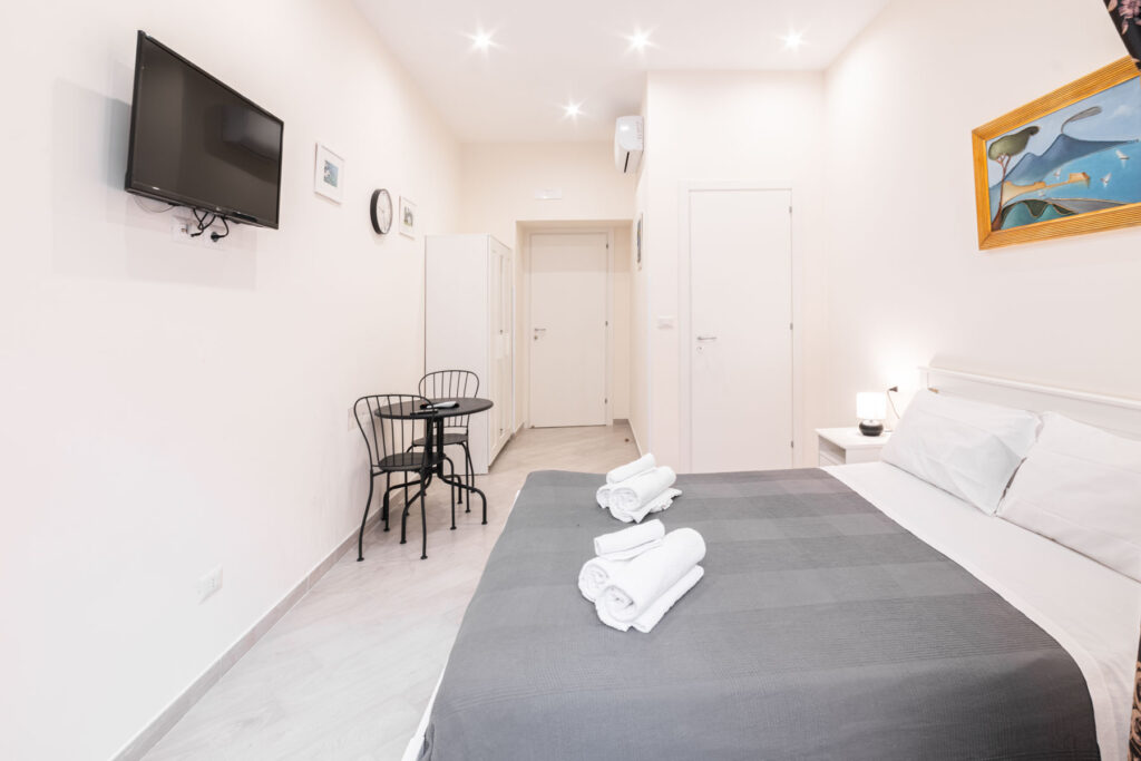 Room21 è un monolocale interno palazzo piano terra composto da un unico ambiente con letto matrimoniale, angolo cottura e bagno completo con doccia.