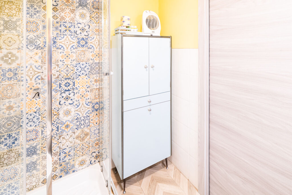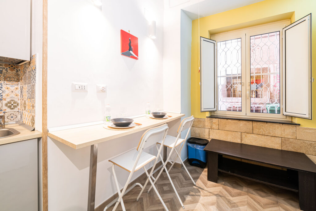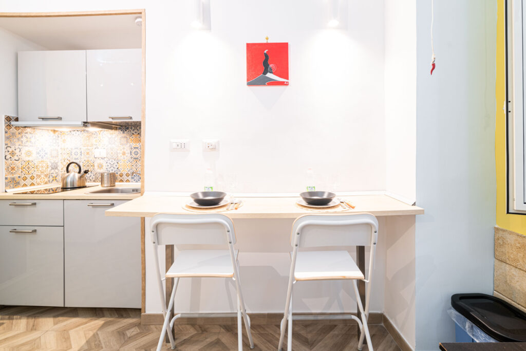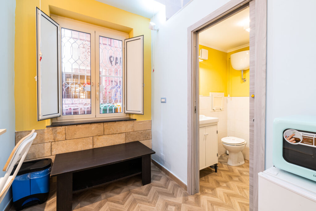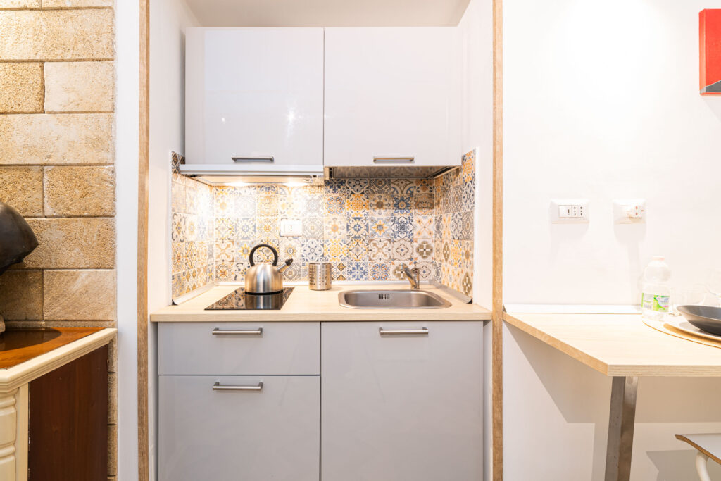 Room21 è un monolocale interno palazzo piano terra composto da un unico ambiente con letto matrimoniale, angolo cottura e bagno completo con doccia.